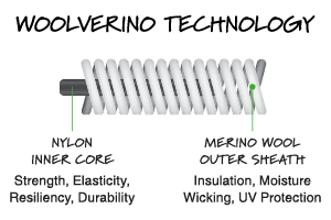 Woolverino's Core Spun Technology brings you a merino garment that is durable, athletically fitted and high-performing. Warm when you need it. Cool when you don't. Nylon inner core offers strength, elasticity, resiliency, and durability. Merino Wool outer sheath provides insulation, moisture-wicking, and UV protection.